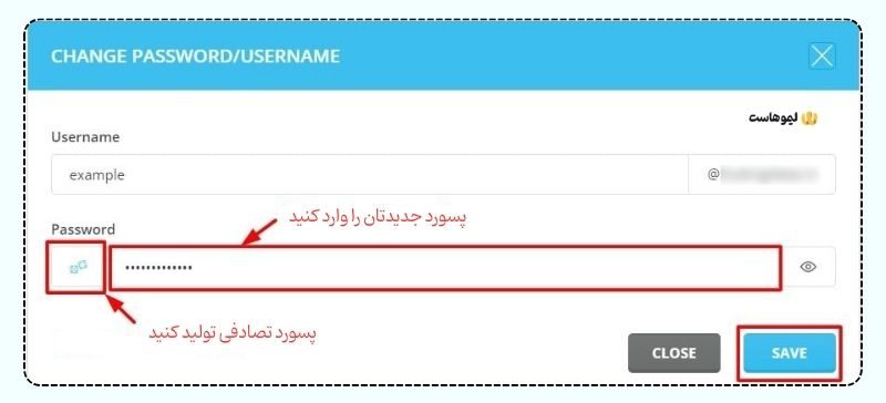 با کلیک روی این گزینه، یک پنجره جدید باز میشود که در این بخش میتوانید در قسمت Password، یک رمز عبور جدید وارد کنید. اگر گذرواژهای قوی به ذهنتان نمیرسد، با کلیک روی آیکونی که در تصویر مشخص شده، میتوانید یک رمز رندوم و قوی تولید کنید.