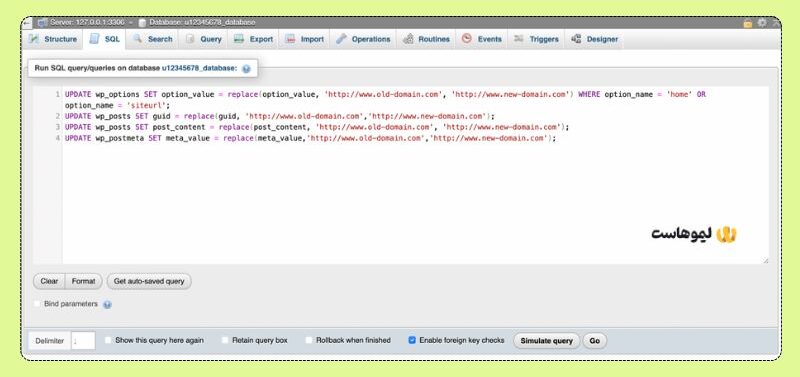 اگر این خطا پس از مهاجرت سایت یا تغییر دامنه رخ داده، احتمالاً آدرس قدیمی هنوز در دیتابیس ذخیره شده است. برای حل این مشکل، از phpMyAdmin کوئری‌های زیر را اجرا کنید (قبل از اجرا حتماً بکاپ بگیرید):