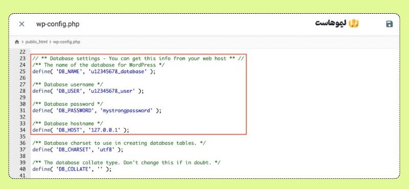• با File Manager یا FTP، فایل wp-config.php را در روت سایت (معمولاً public_html) باز کنید و مقادیر زیر را پیدا کنید: